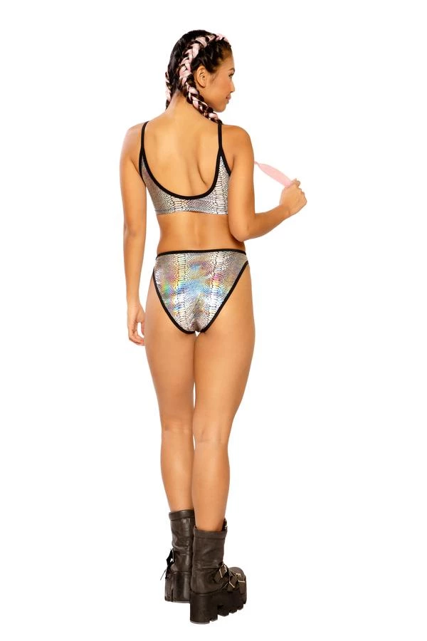 Comes with a holographic spaghetti-strap cropped tank and matching holographic high-waist bottoms.