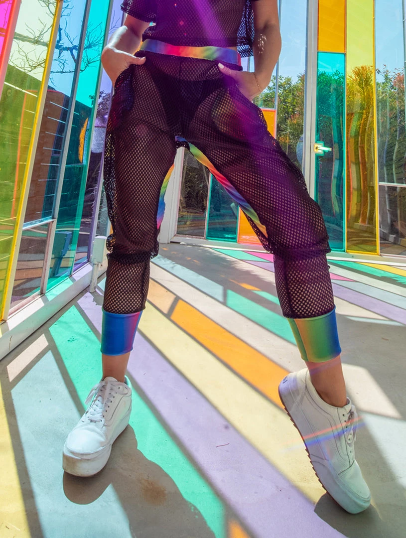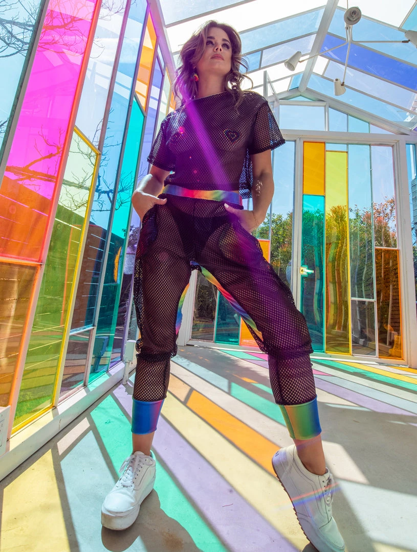 Shuffle it up on the dance floor in this streetwear-inspired rainbow trimmed mesh outfit from J. Valentine!