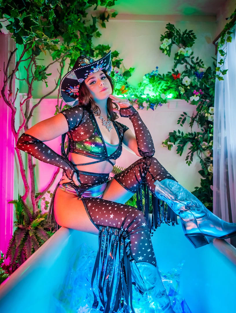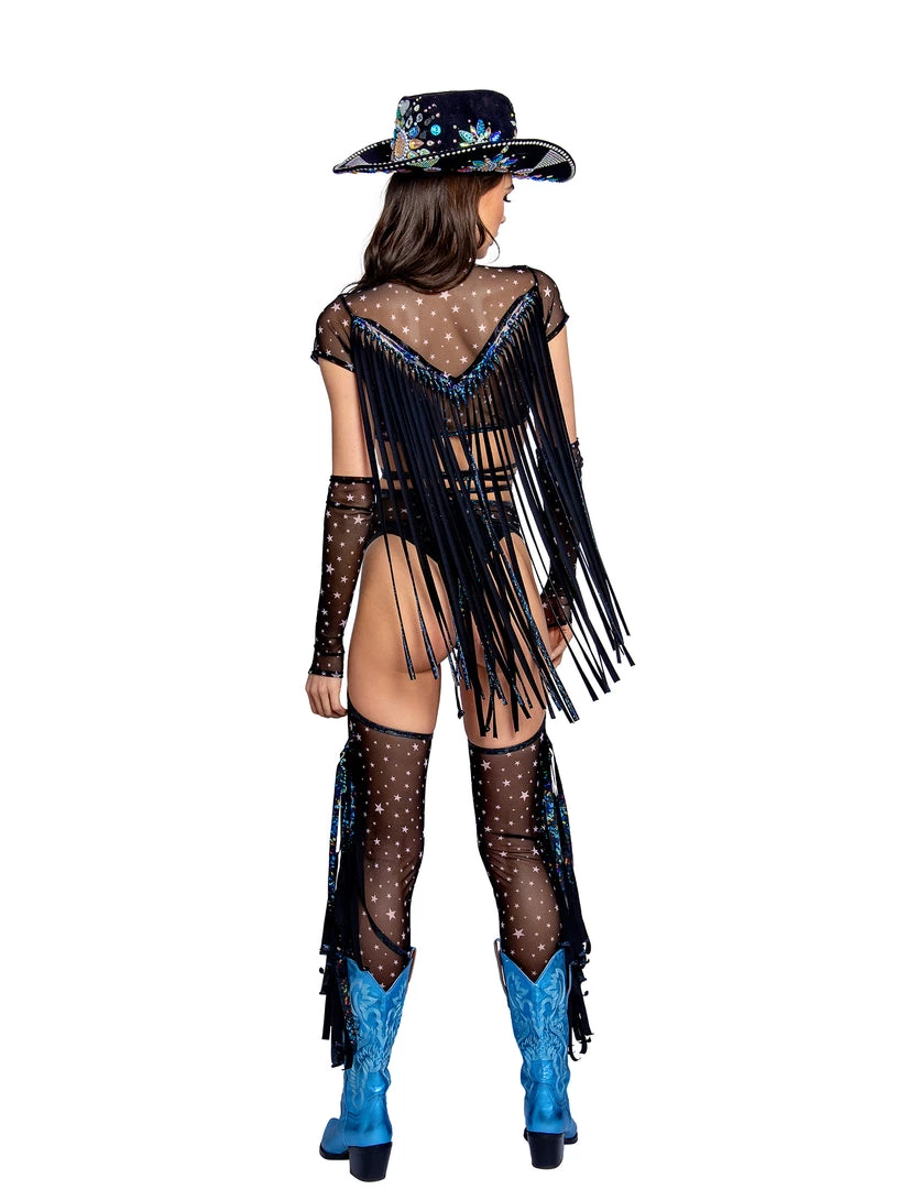 You’re attracting nothing but good karma in this super sexy mesh fringe outfit!Â