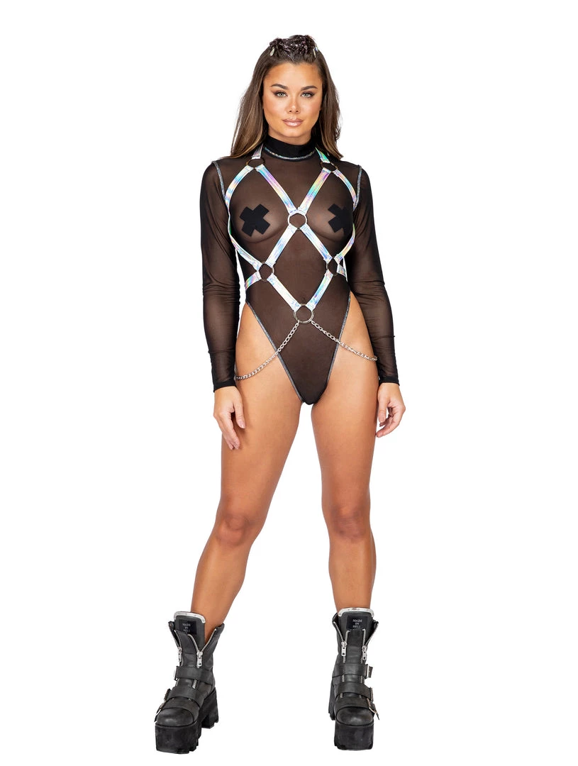 Get yourself decked out in this versatile silver holographic criss-cross body harness with chain detail for your next event!
