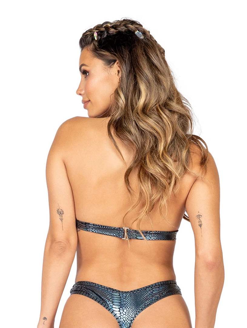 Be the life of the *rave*party in this halter-neck and clasp-back triangle metallic snake print top!